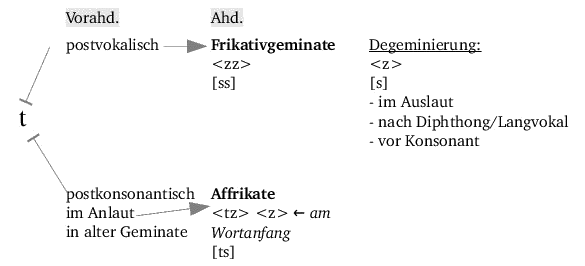 Im Althochdeutschen entsteht aus germ. [t] durch die 2. Lautverschiebung (Tenuesverschiebung) in postvokalischer Stellung die Frikativgeminate [zz], die wiederum im Auslaut degeminiert wird (> [z]).