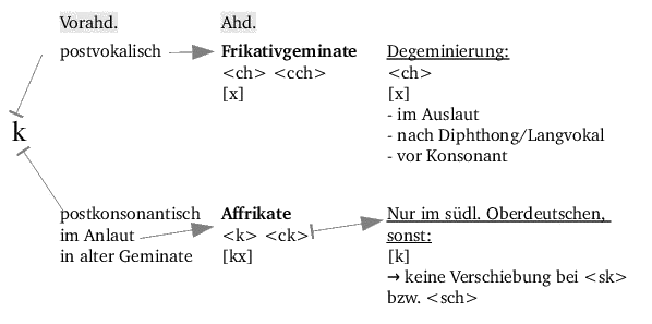 Neben der Binnendifferenzierung des deutschen Sprachgebiets, hat die zweite Lautverschiebung zur Folge, dass Affrikaten entstehen und Wörter mit (Doppel-)Frikativen zunehmen.