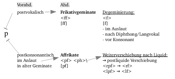 Durch die zweite Lautverschiebung verändern sich die stimmlosen Plosive [p], [t], [k], wobei die Veränderung abhängig von der lautlichen Umgebung ist.